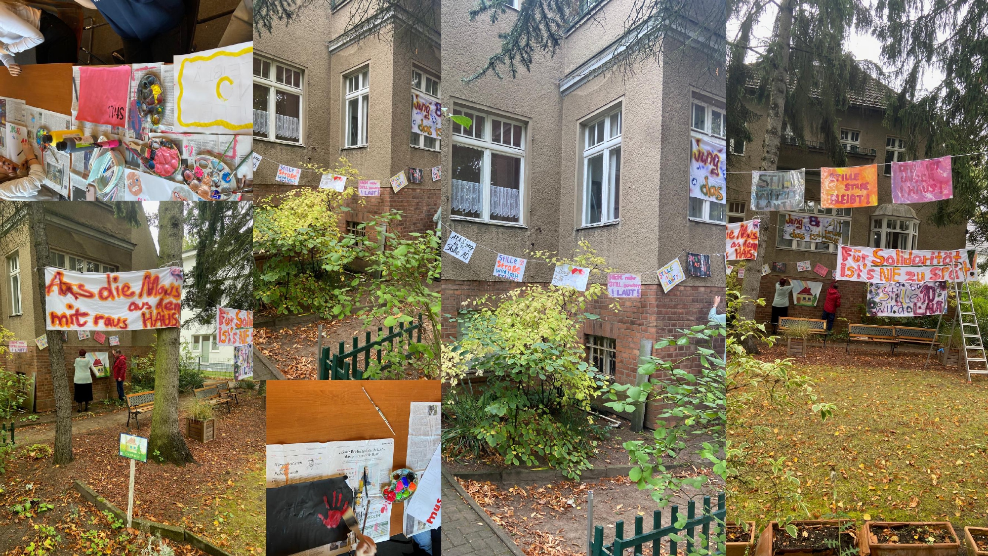 Nun droht der Begegnungsstätte nach 13 Jahren das Aus! Wir unterstützen den Protest der Stillen Straße 10 und das konnte man Mitte Oktober in den Medien und in der Abendschau sehen, als die von uns gemalten Transparente und Plakate den Hintergrund für die Berichterstattung bildeten. Wenn die Seniorinnen und Senioren am 4. November lautstark vor dem Versammlungsraum der Pankower BVV auf ihren Protest verweisen, wird auch eins unserer Transparente dabei sein. Darauf sind wir stolz!